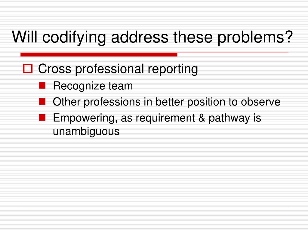 Will codifying address these problems? • Cross professional reporting • Recognize team • Other professions in better position to observe • Empowering, as requirement & pathway is unambiguous