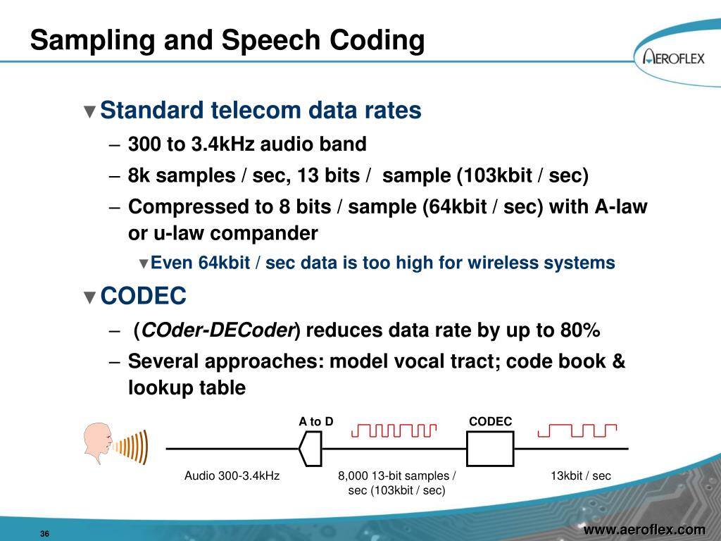 A to D CODEC Audio 300-3.4kHz 8,000 13-bit samples / sec (103kbit / sec) 13kbit / sec Sampling and Speech Coding • Standard telecom data rates • 300 to 3.4kHz audio band • 8k samples / sec, 13 bits / sample (103kbit / sec) • Compressed to 8 bits / sample (64kbit / sec) with A-law or u-law compander • Even 64kbit / sec data is too high for wireless systems • CODEC • (COder-DECoder) reduces data rate by up to 80% • Several approaches: model vocal tract; code book & lookup table