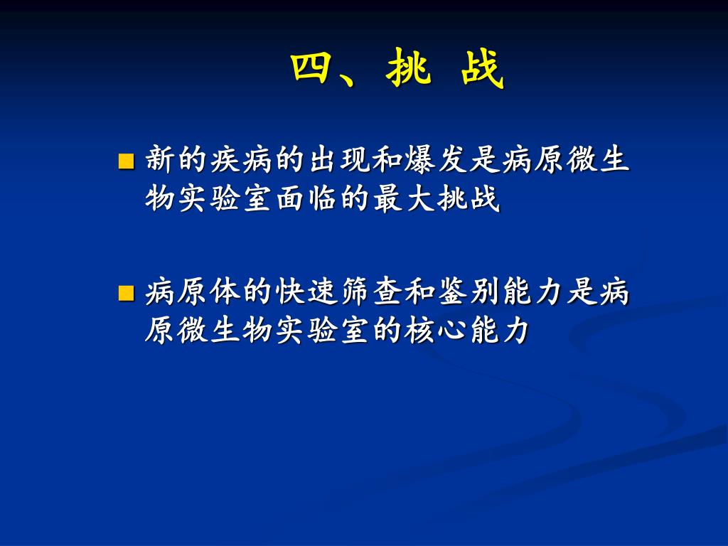 四、挑 战 新的疾病的出现和爆发是病原微生物实验室面临的最大挑战 病原体的快速筛查和鉴别能力是病原微生物实验室的核心能力