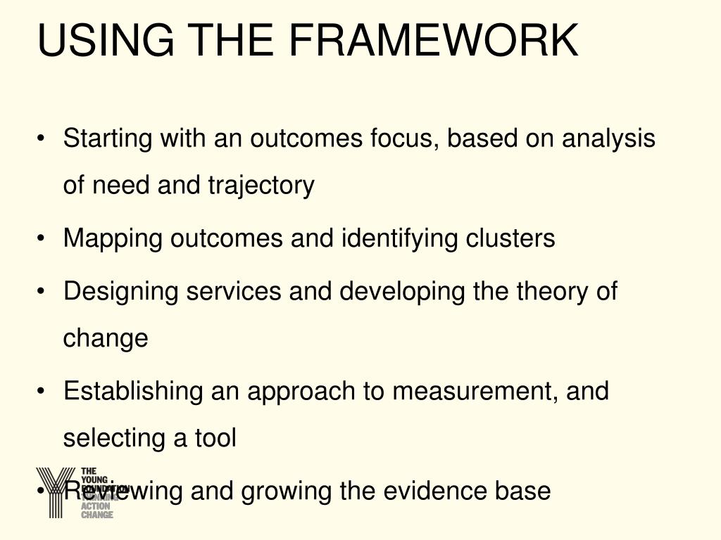 Using the framework Starting with an outcomes focus, based on analysis of need and trajectory Mapping outcomes and identifying clusters Designing services and developing the theory of change Establishing an approach to measurement, and selecting a tool Reviewing and growing the evidence base