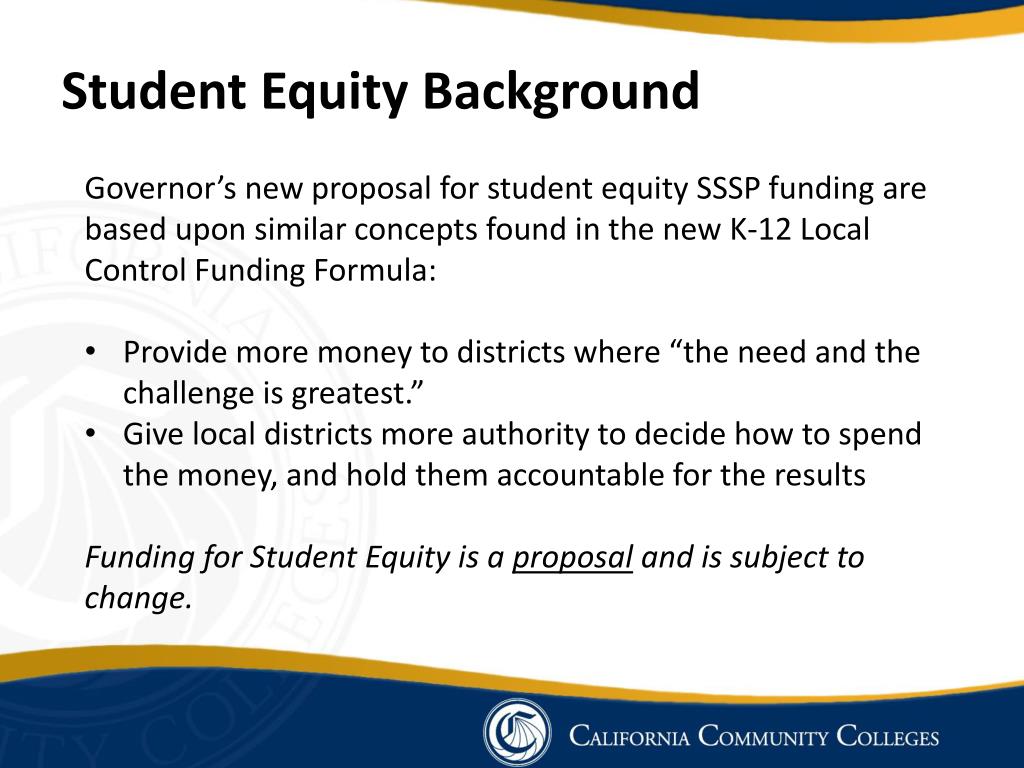 Student Equity Background • Governor’s new proposal for student equity SSSP funding are based upon similar concepts found in the new K-12 Local Control Funding Formula: • Provide more money to districts where “the need and the challenge is greatest.” • Give local districts more authority to decide how to spend the money, and hold them accountable for the results • Funding for Student Equity is a proposal and is subject to change.