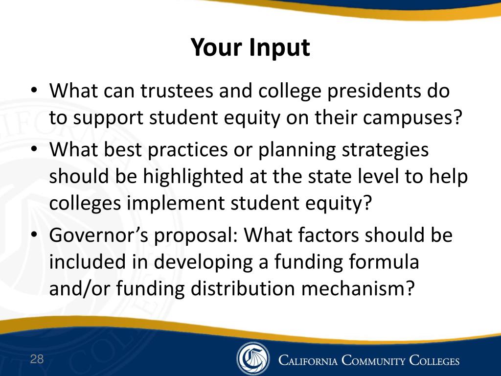 Your Input What can trustees and college presidents do to support student equity on their campuses? What best practices or planning strategies should be highlighted at the state level to help colleges implement student equity? Governor’s proposal: What factors should be included in developing a funding formula and/or funding distribution mechanism?