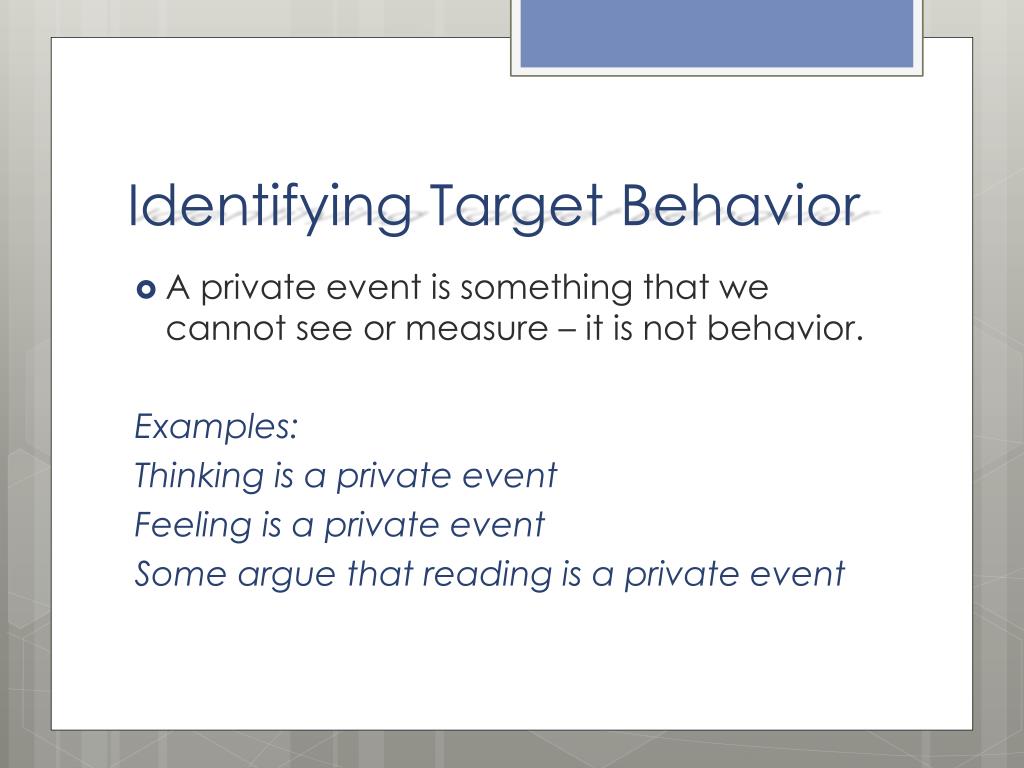 Identifying Target Behavior • A private event is something that we cannot see or measure – it is not behavior. Examples: Thinking is a private event Feeling is a private event Some argue that reading is a private event