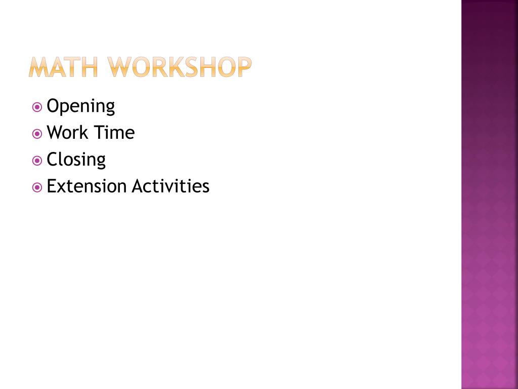Math Workshop • Opening • Work Time • Closing • Extension Activities