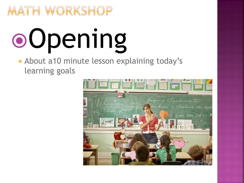 Math Workshop • Opening • About a10 minute lesson explaining today’s learning goals