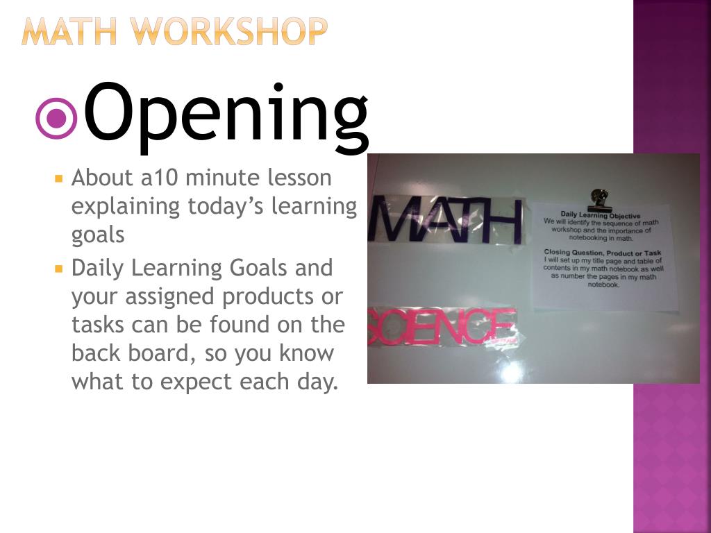Math Workshop • Opening • About a10 minute lesson explaining today’s learning goals • Daily Learning Goals and your assigned products or tasks can be found on the back board, so you know what to expect each day.