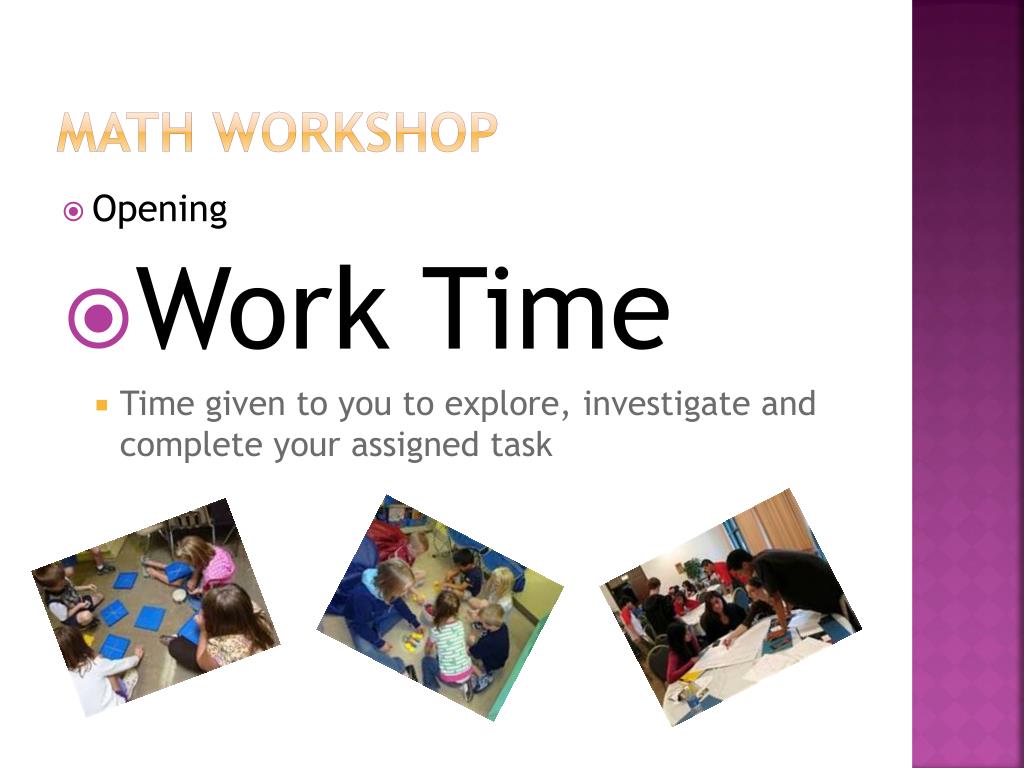 Math Workshop • Opening • Work Time • Time given to you to explore, investigate and complete your assigned task