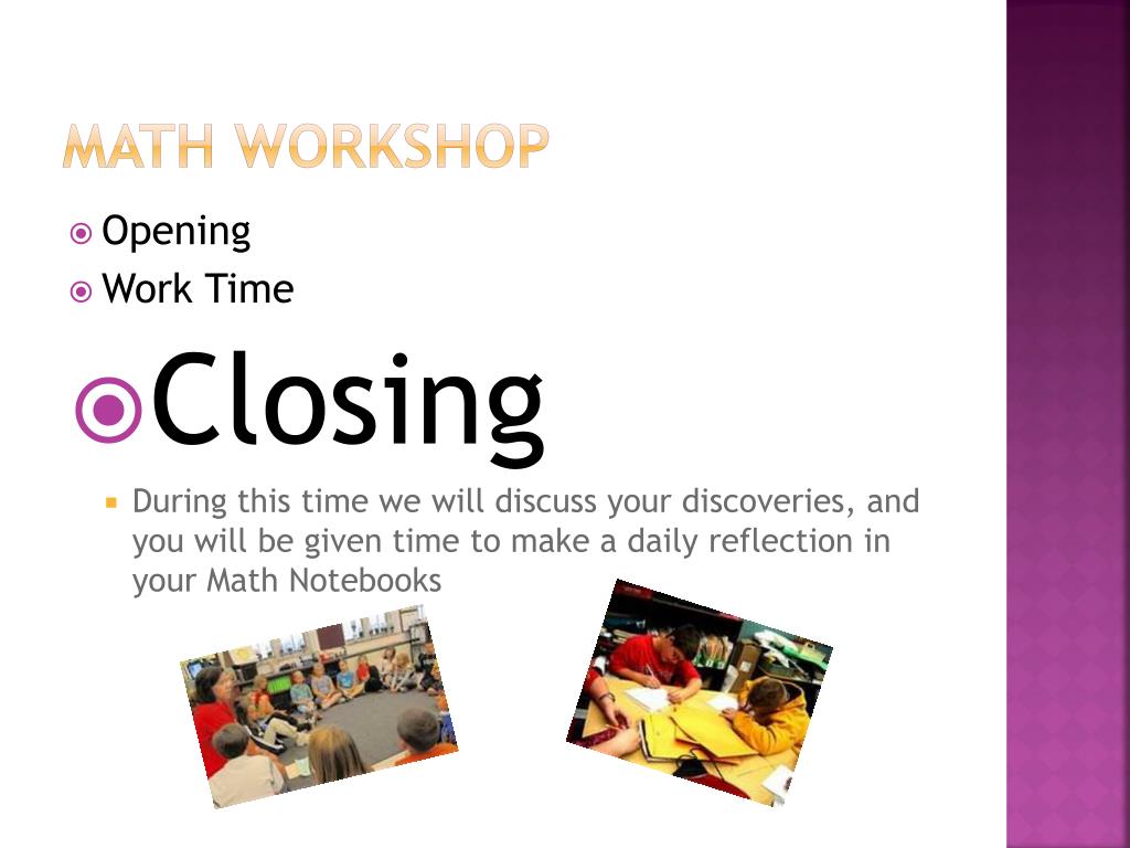 Math Workshop • Opening • Work Time • Closing • During this time we will discuss your discoveries, and you will be given time to make a daily reflection in your Math Notebooks