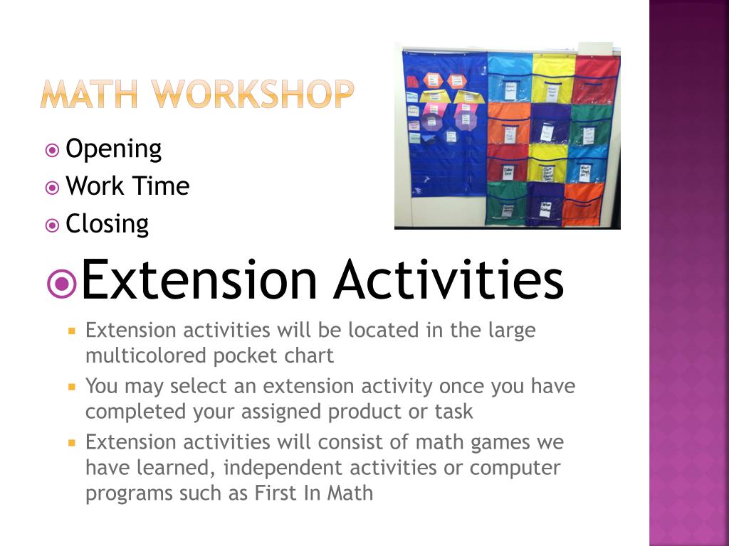 Math Workshop • Opening • Work Time • Closing • Extension Activities • Extension activities will be located in the large multicolored pocket chart • You may select an extension activity once you have completed your assigned product or task • Extension activities will consist of math games we have learned, independent activities or computer programs such as First In Math