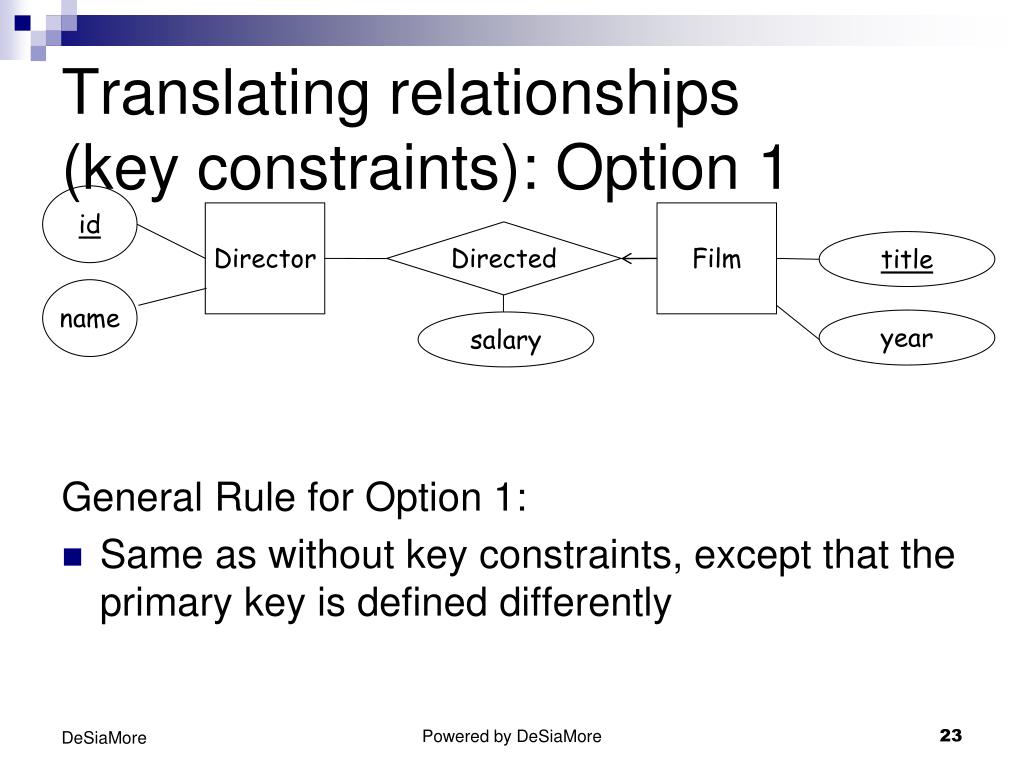 Translating relationships(key constraints): Option 1 id Director Film General Rule for Option 1: • Same as without key constraints, except that the primary key is defined differently Directed title name year salary Powered by DeSiaMore