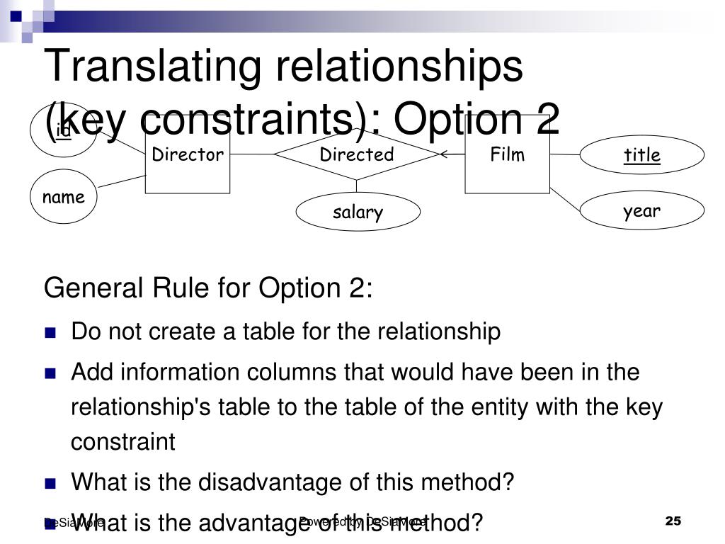 Translating relationships(key constraints): Option 2 id Director Film Directed title General Rule for Option 2: • Do not create a table for the relationship • Add information columns that would have been in the relationship's table to the table of the entity with the key constraint • What is the disadvantage of this method? • What is the advantage of this method? name year salary Powered by DeSiaMore