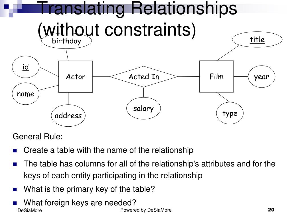 Translating Relationships (without constraints) title birthday id Film Actor General Rule: • Create a table with the name of the relationship • The table has columns for all of the relationship's attributes and for the keys of each entity participating in the relationship • What is the primary key of the table? • What foreign keys are needed? year Acted In name salary type address Powered by DeSiaMore