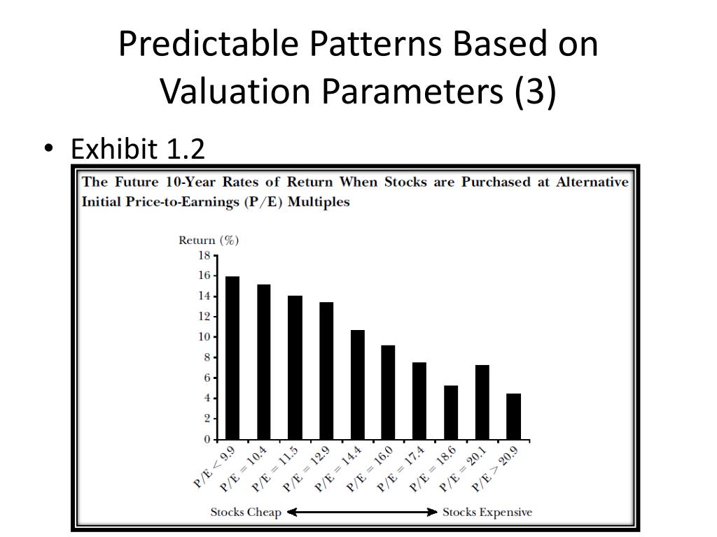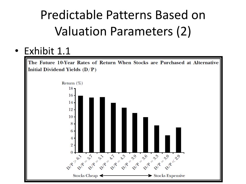 Predictable Patterns Based on Valuation Parameters (1) • Predicting future returns from initial dividends yields (exhibit 1.1) • Predicting market returns from initial price-earnings multiples (exhibit 1.2) • Other predictable time series patterns