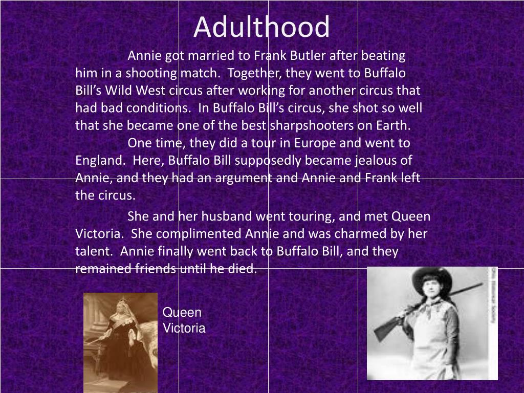 Adulthood Annie got married to Frank Butler after beating him in a shooting match. Together, they went to Buffalo Bill’s Wild West circus after working for another circus that had bad conditions. In Buffalo Bill’s circus, she shot so well that she became one of the best sharpshooters on Earth. One time, they did a tour in Europe and went to England. Here, Buffalo Bill supposedly became jealous of Annie, and they had an argument and Annie and Frank left the circus. She and her husband went touring, and met Queen Victoria. She complimented Annie and was charmed by her talent. Annie finally went back to Buffalo Bill, and they remained friends until he died. Queen Victoria