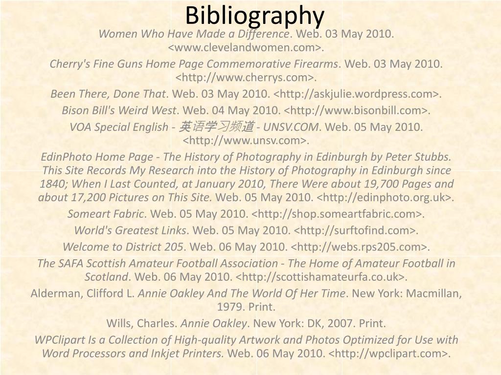Bibliography Women Who Have Made a Difference. Web. 03 May 2010. <www.clevelandwomen.com>. Cherry's Fine Guns Home Page Commemorative Firearms. Web. 03 May 2010. <http://www.cherrys.com>. Been There, Done That. Web. 03 May 2010. <http://askjulie.wordpress.com>. Bison Bill's Weird West. Web. 04 May 2010. <http://www.bisonbill.com>. VOA Special English - 英语学习频道 - UNSV.COM. Web. 05 May 2010. <http://www.unsv.com>. EdinPhoto Home Page - The History of Photography in Edinburgh by Peter Stubbs. This Site Records My Research into the History of Photography in Edinburgh since 1840; When I Last Counted, at January 2010, There Were about 19,700 Pages and about 17,200 Pictures on This Site. Web. 05 May 2010. <http://edinphoto.org.uk>. Someart Fabric. Web. 05 May 2010. <http://shop.someartfabric.com>. World's Greatest Links. Web. 05 May 2010. <http://surftofind.com>. Welcome to District 205. Web. 06 May 2010. <http://webs.rps205.com>. The SAFA Scottish Amateur Football Association - The Home of Amateur Football in Scotland. Web. 06 May 2010. <http://scottishamateurfa.co.uk>. Alderman, Clifford L. Annie Oakley And The World Of Her Time. New York: Macmillan, 1979. Print. Wills, Charles. Annie Oakley. New York: DK, 2007. Print. WPClipart Is a Collection of High-quality Artwork and Photos Optimized for Use with Word Processors and Inkjet Printers. Web. 06 May 2010. <http://wpclipart.com>.