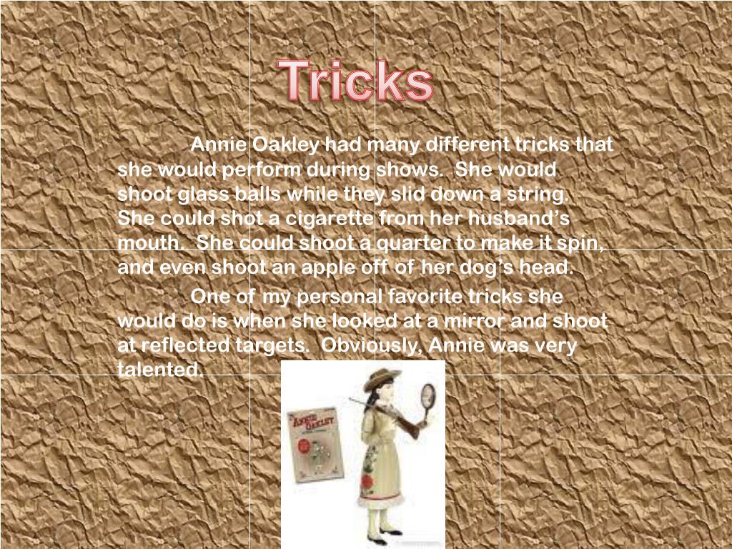 Tricks Annie Oakley had many different tricks that she would perform during shows. She would shoot glass balls while they slid down a string. She could shot a cigarette from her husband’s mouth. She could shoot a quarter to make it spin, and even shoot an apple off of her dog’s head. One of my personal favorite tricks she would do is when she looked at a mirror and shoot at reflected targets. Obviously, Annie was very talented.