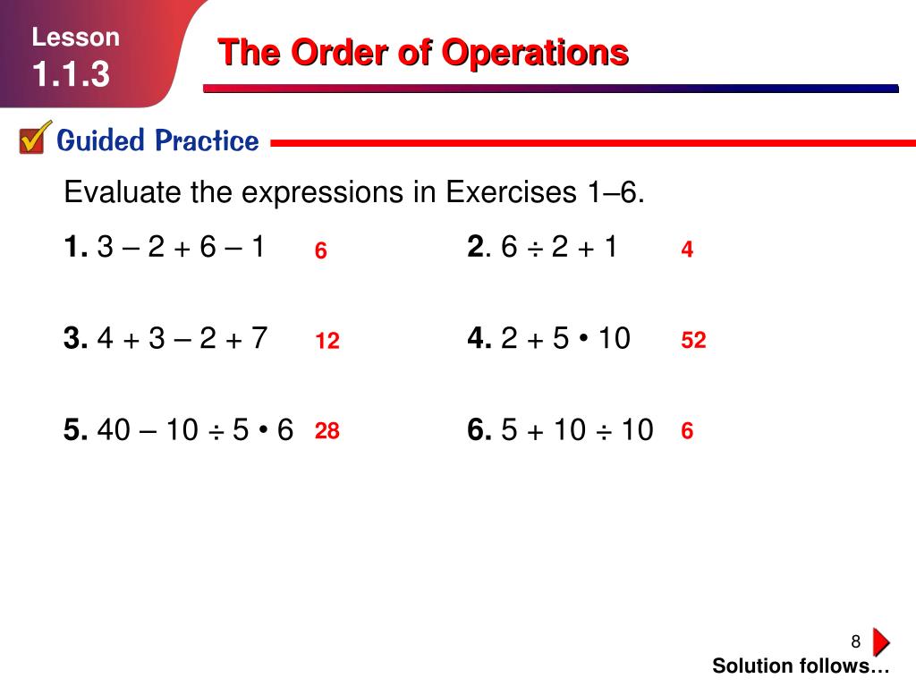 The Order of Operations. Lesson 1.1.3. Lesson 1.1.3. The Order of Operations. California Standard: Algebra and Functions 1.2. What it means for you:. You’ll learn about the special order to follow when you’re deciding which part of an expression to evaluate first.