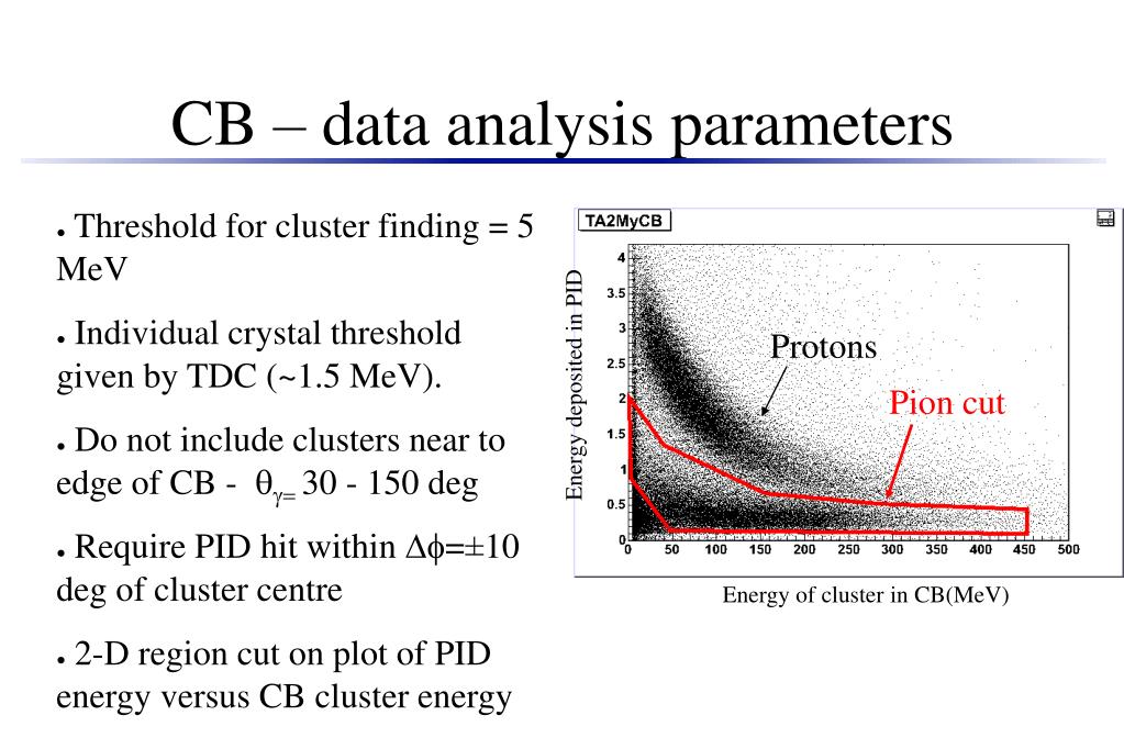 CB – data analysis parameters • Threshold for cluster finding = 5 MeV • Individual crystal threshold given by TDC (~1.5 MeV). • Do not include clusters near to edge of CB - qg= 30 - 150 deg • Require PID hit within Df=±10 deg of cluster centre • 2-D region cut on plot of PID energy versus CB cluster energy Protons Energy deposited in PID Pion cut Energy of cluster in CB(MeV)