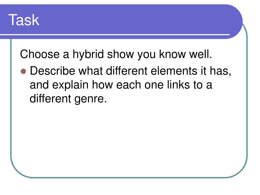 Task Choose a hybrid show you know well. • Describe what different elements it has, and explain how each one links to a different genre.