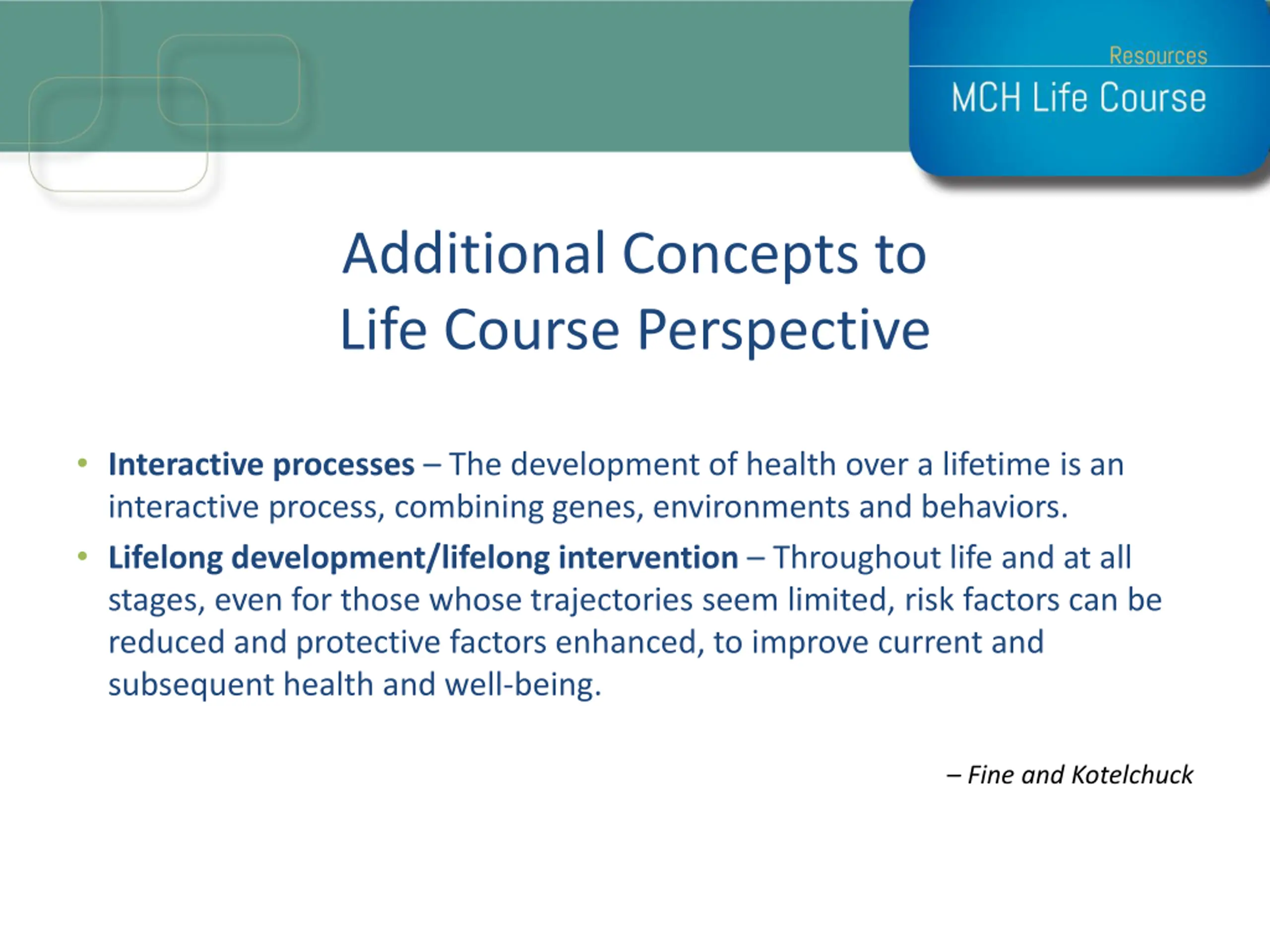19. Additional Concepts to Life Course Perspective • Interactive processes – The development of health over a lifetime is an interactive process, combining genes, environments and behaviors. • Lifelong development/lifelong intervention – Throughout life and at all stages, even for those whose trajectories seem limited, risk factors can be reduced and protective factors enhanced, to improve current and subsequent health and well-being. – Fine and Kotelchuck