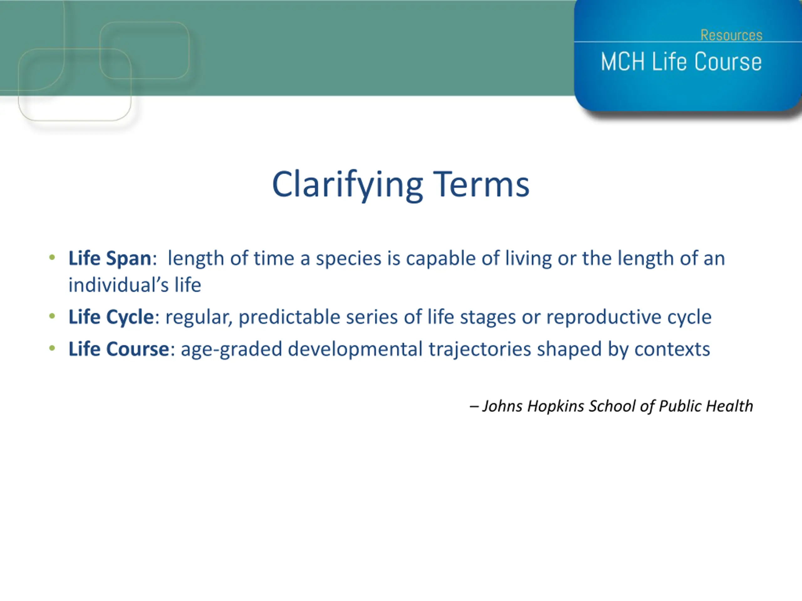 3. Clarifying Terms • Life Span: length of time a species is capable of living or the length of an individual’s life • Life Cycle: regular, predictable series of life stages or reproductive cycle • Life Course: age-graded developmental trajectories shaped by contexts – Johns Hopkins School of Public Health