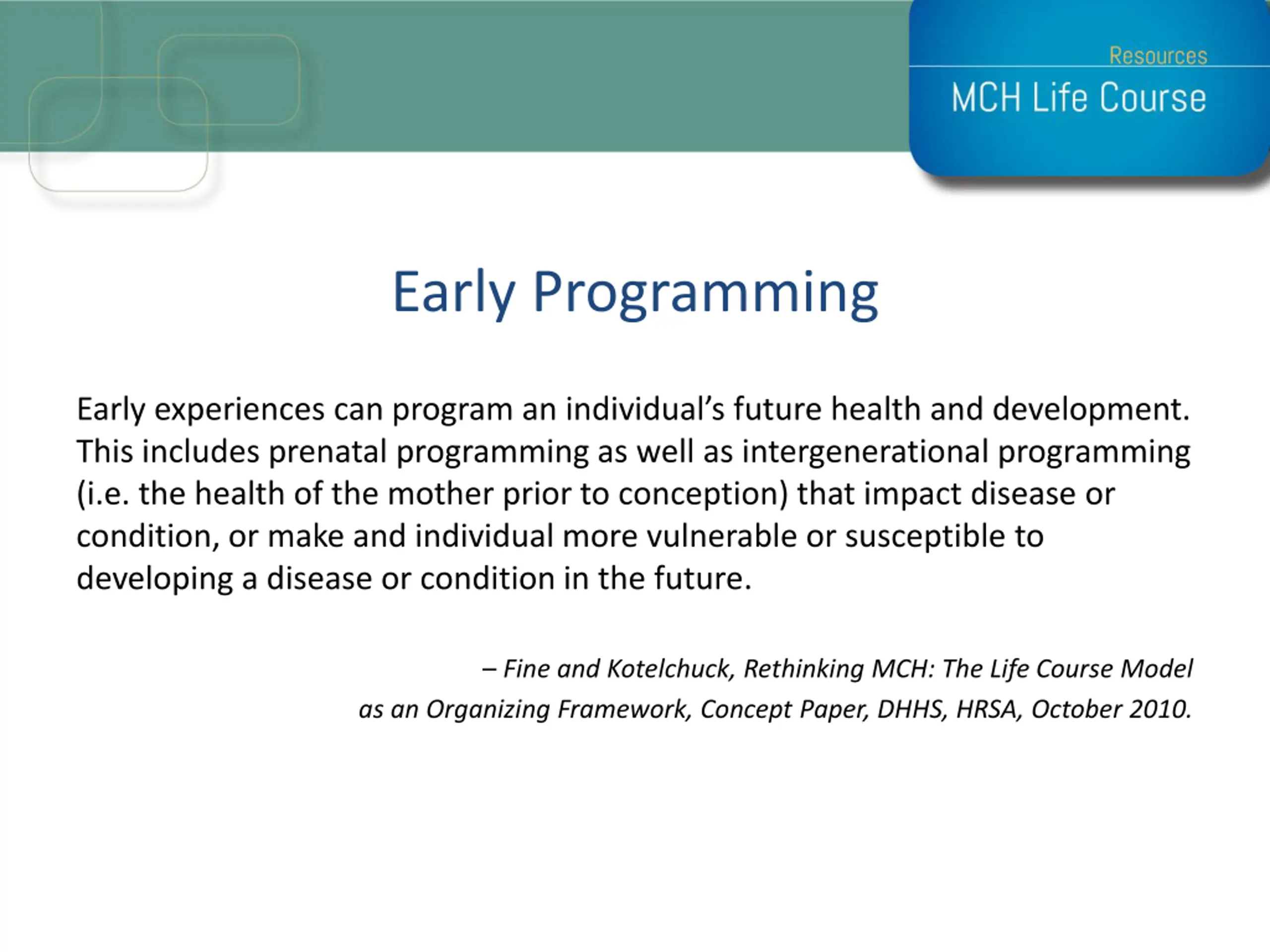 13. Early Programming Early experiences can program an individual’s future health and development. This includes prenatal programming as well as intergenerational programming (i.e. the health of the mother prior to conception) that impact disease or condition, or make and individual more vulnerable or susceptible to developing a disease or condition in the future. – Fine and Kotelchuck, Rethinking MCH: The Life Course Model as an Organizing Framework, Concept Paper, DHHS, HRSA, October 2010.
