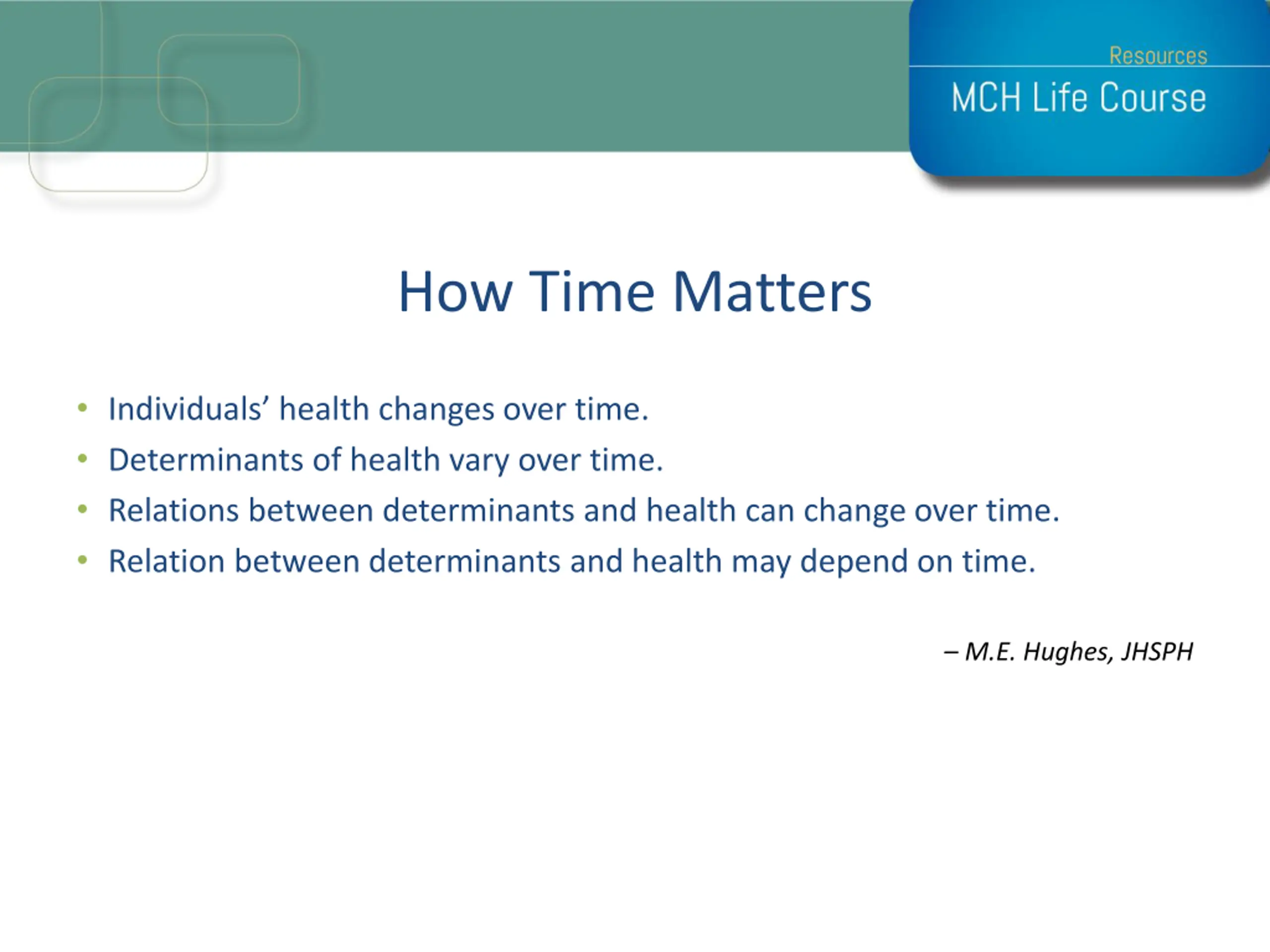 6. A life course approach recognizes the role of time in shaping health outcomes and incorporates time into models explaining health outcomes.