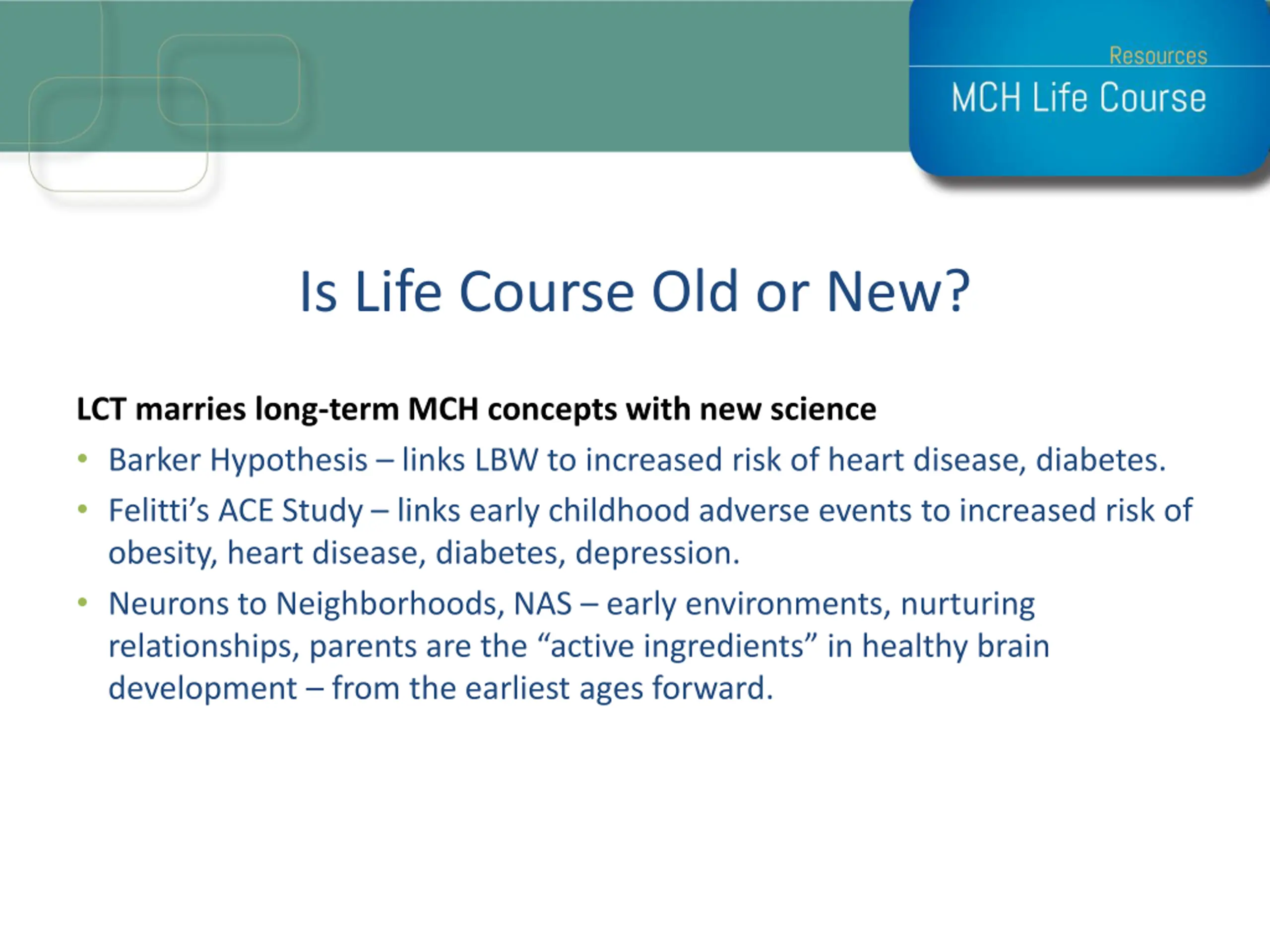 16. Is Life Course Old or New? LCT marries long-term MCH concepts with new science • Barker Hypothesis – links LBW to increased risk of heart disease, diabetes. • Felitti’s ACE Study – links early childhood adverse events to increased risk of obesity, heart disease, diabetes, depression. • Neurons to Neighborhoods, NAS – early environments, nurturing relationships, parents are the “active ingredients” in healthy brain development – from the earliest ages forward.