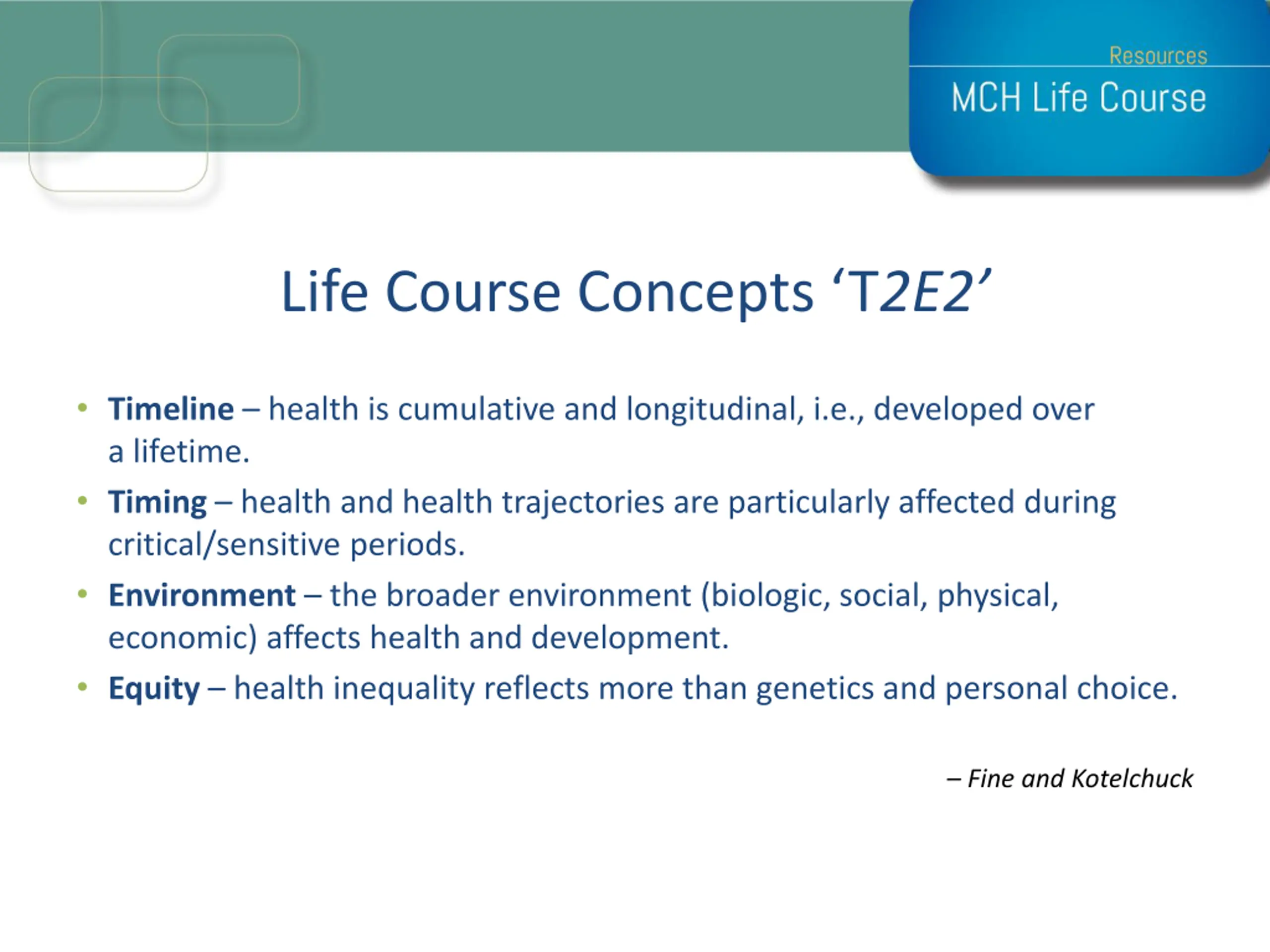 5. Life Course Concepts ‘T2E2’ • Timeline – health is cumulative and longitudinal, i.e., developed over a lifetime. • Timing – health and health trajectories are particularly affected during critical/sensitive periods. • Environment – the broader environment (biologic, social, physical, economic) affects health and development. • Equity – health inequality reflects more than genetics and personal choice. – Fine and Kotelchuck