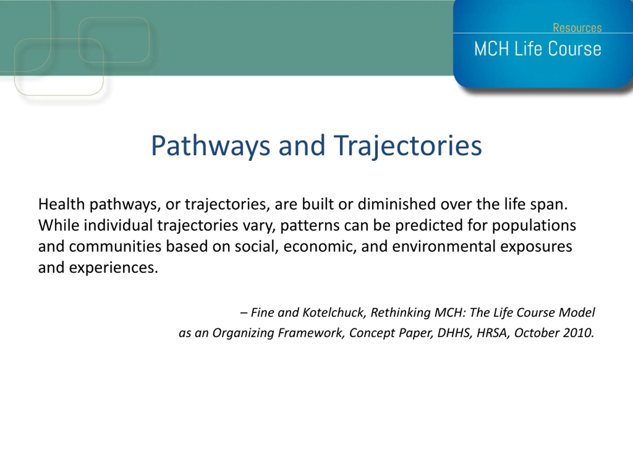 12. Pathways and Trajectories Health pathways, or trajectories, are built or diminished over the life span. While individual trajectories vary, patterns can be predicted for populations and communities based on social, economic, and environmental exposures and experiences. – Fine and Kotelchuck, Rethinking MCH: The Life Course Model as an Organizing Framework, Concept Paper, DHHS, HRSA, October 2010.