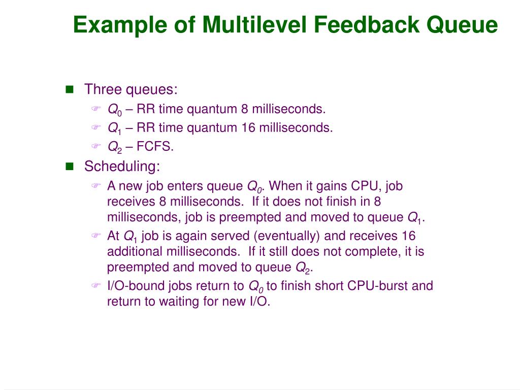Example of Multilevel Feedback Queue • Three queues: • Q0 – RR time quantum 8 milliseconds. • Q1 – RR time quantum 16 milliseconds. • Q2 – FCFS. • Scheduling: • A new job enters queue Q0. When it gains CPU, job receives 8 milliseconds. If it does not finish in 8 milliseconds, job is preempted and moved to queue Q1. • At Q1 job is again served (eventually) and receives 16 additional milliseconds. If it still does not complete, it is preempted and moved to queue Q2. • I/O-bound jobs return to Q0 to finish short CPU-burst and return to waiting for new I/O.