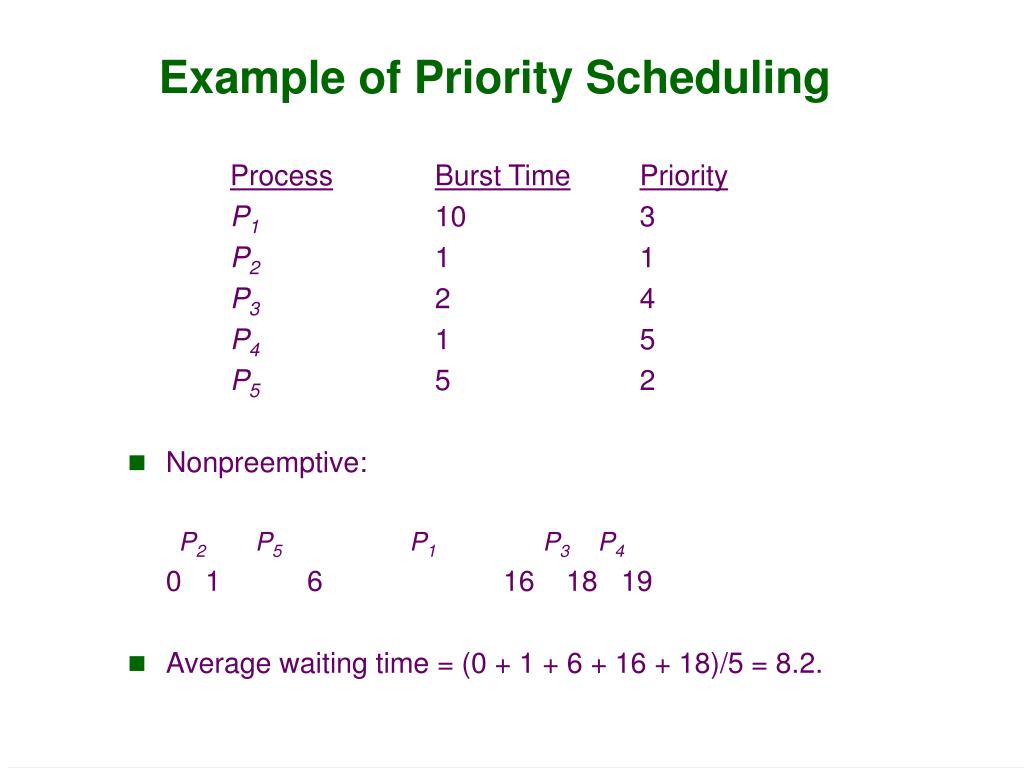 Example of Priority Scheduling ProcessBurst TimePriority P1 10 3 P2 1 1 P3 2 4 P4 1 5 P5 5 2 • Nonpreemptive: P2P5P1P3P4 0 1 6 16 18 19 • Average waiting time = (0 + 1 + 6 + 16 + 18)/5 = 8.2.