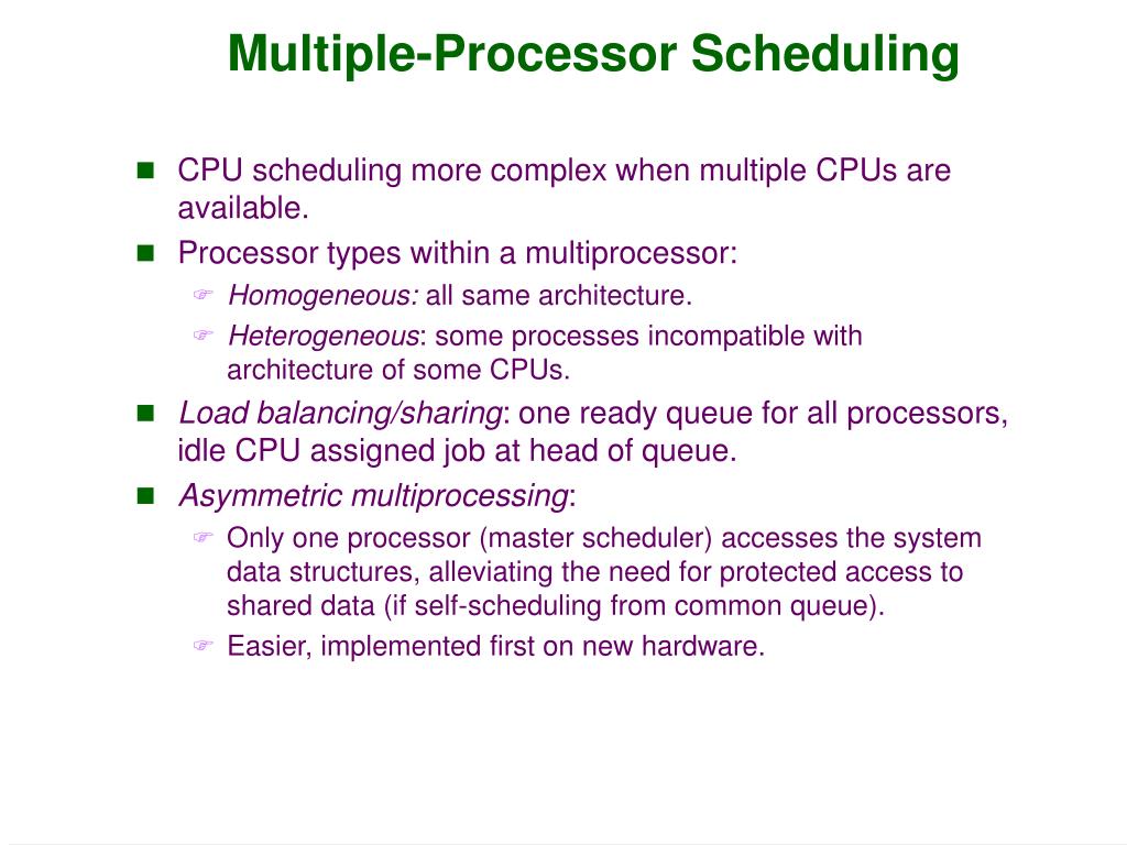 Multiple-Processor Scheduling • CPU scheduling more complex when multiple CPUs are available. • Processor types within a multiprocessor: • Homogeneous: all same architecture. • Heterogeneous: some processes incompatible with architecture of some CPUs. • Load balancing/sharing: one ready queue for all processors, idle CPU assigned job at head of queue. • Asymmetric multiprocessing: • Only one processor (master scheduler) accesses the system data structures, alleviating the need for protected access to shared data (if self-scheduling from common queue). • Easier, implemented first on new hardware.