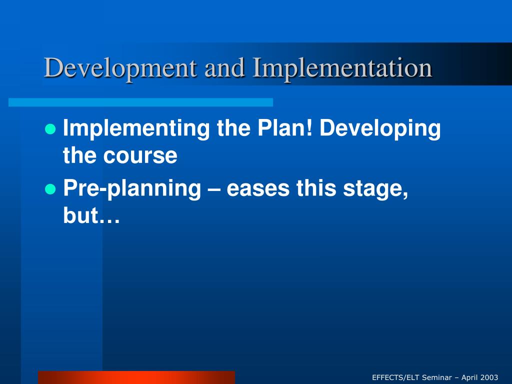 Development and Implementation • Implementing the Plan! Developing the course • Pre-planning – eases this stage, but… EFFECTS/ELT Seminar – April 2003