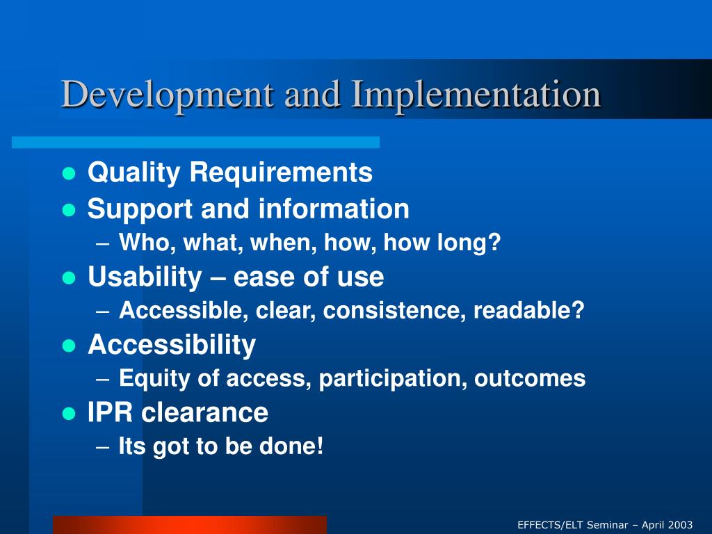 Development and Implementation • Quality Requirements • Support and information • Who, what, when, how, how long? • Usability – ease of use • Accessible, clear, consistence, readable? • Accessibility • Equity of access, participation, outcomes • IPR clearance • Its got to be done! EFFECTS/ELT Seminar – April 2003