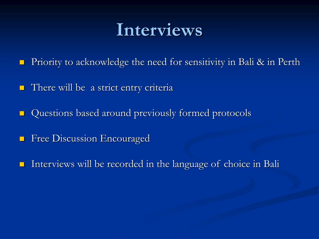 Interviews • Priority to acknowledge the need for sensitivity in Bali & in Perth • There will be a strict entry criteria • Questions based around previously formed protocols • Free Discussion Encouraged • Interviews will be recorded in the language of choice in Bali