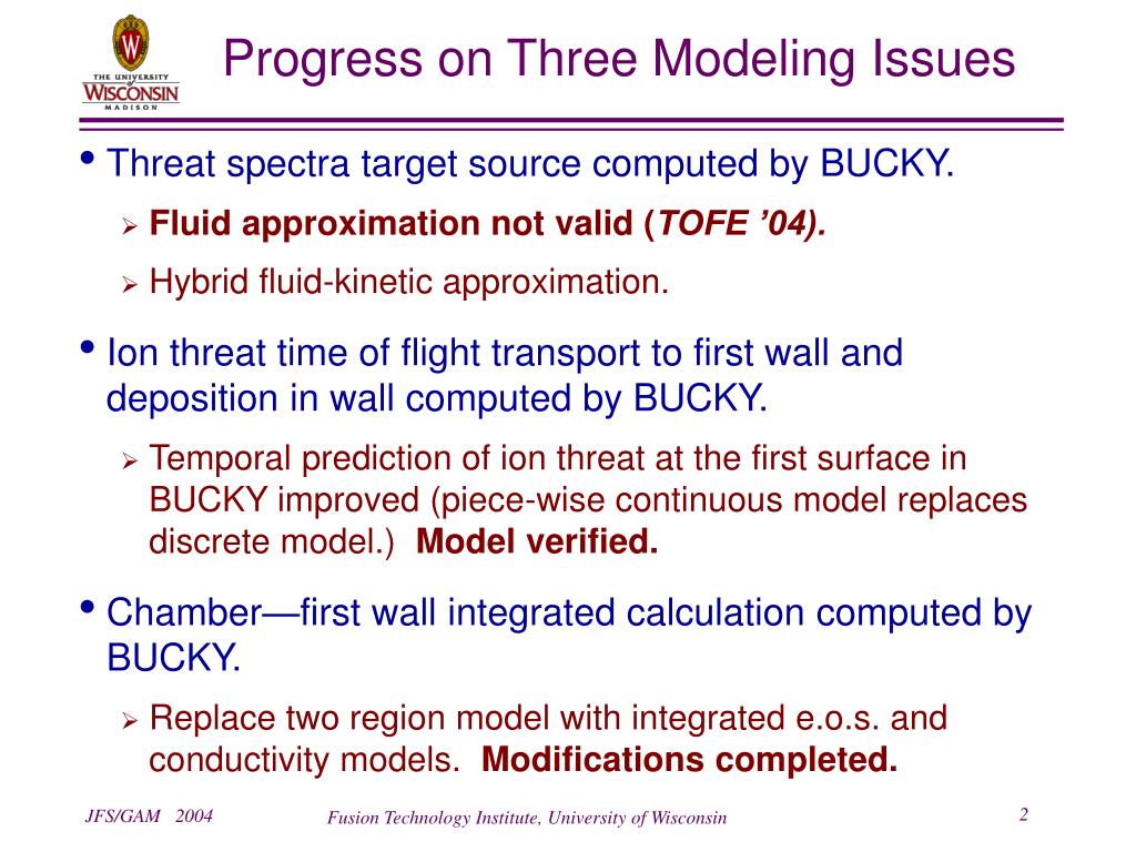Threat Spectra Calculations for HAPL Chamber First Wall Greg Moses, John Santarius, and Milad Fatenejad HAPL Team Meeting Princeton Plasma Physics Laboratory October 27-28, 2004. Progress on Three Modeling Issues. Threat spectra target source computed by BUCKY.