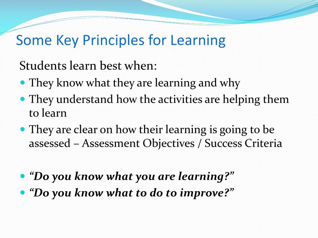 Some Key Principles for Learning Students learn best when: • They know what they are learning and why • They understand how the activities are helping them to learn • They are clear on how their learning is going to be assessed – Assessment Objectives / Success Criteria • “Do you know what you are learning?” • “Do you know what to do to improve?”