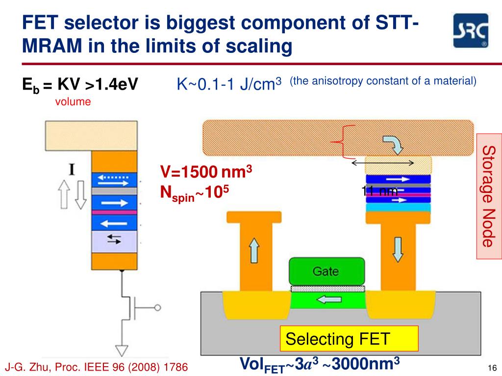 FET selector is biggest component of STT-MRAM in the limits of scaling Eb= KV >1.4eV K~0.1-1 J/cm3 (the anisotropy constant of a material) volume V=1500nm3 Nspin~105 11 nm Storage Node Selecting FET VolFET~3a3 ~3000nm3 J-G. Zhu, Proc. IEEE 96 (2008) 1786