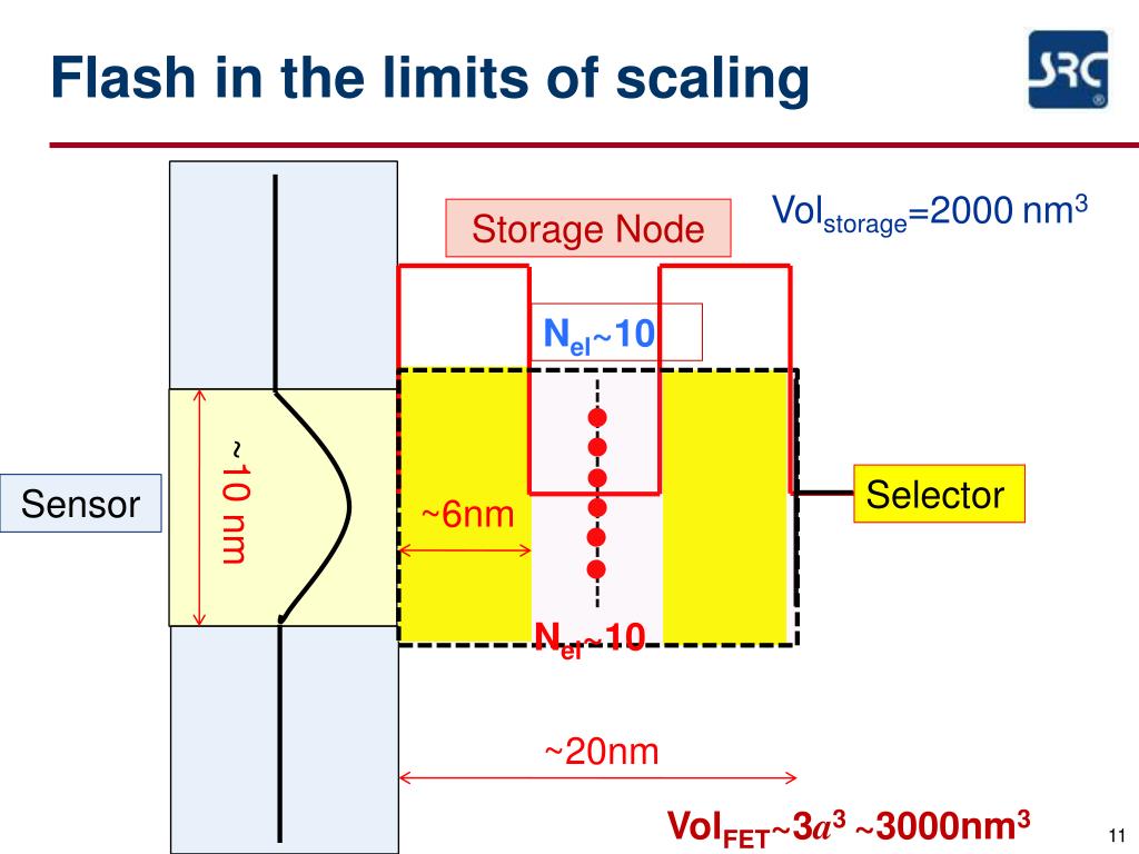 Flash in the limits of scaling Volstorage=2000nm3 Storage Node Nel~10 Selector ~10 nm Sensor ~6nm Nel~10 ~20nm VolFET~3a3 ~3000nm3
