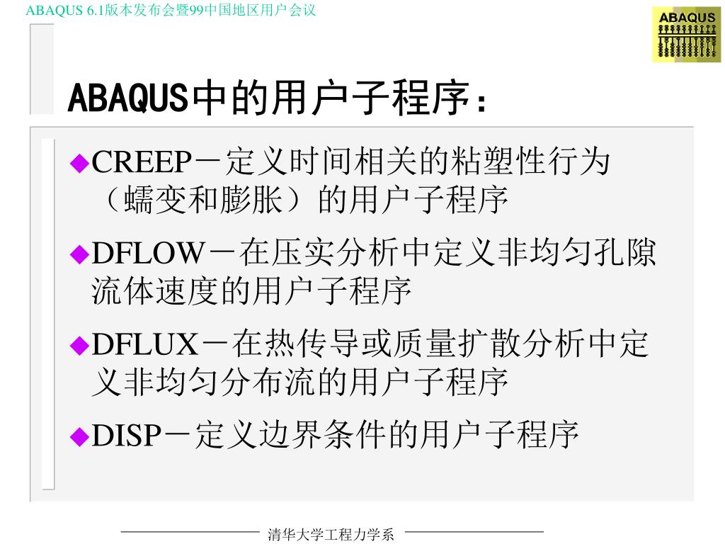 ABAQUS 6.1版本发布会暨99中国地区用户会议 清华大学工程力学系 ABAQUS中的用户子程序: • CREEP-定义时间相关的粘塑性行为(蠕变和膨胀)的用户子程序 • DFLOW-在压实分析中定义非均匀孔隙 流体速度的用户子程序 • DFLUX-在热传导或质量扩散分析中定义非均匀分布流的用户子程序 • DISP-定义边界条件的用户子程序