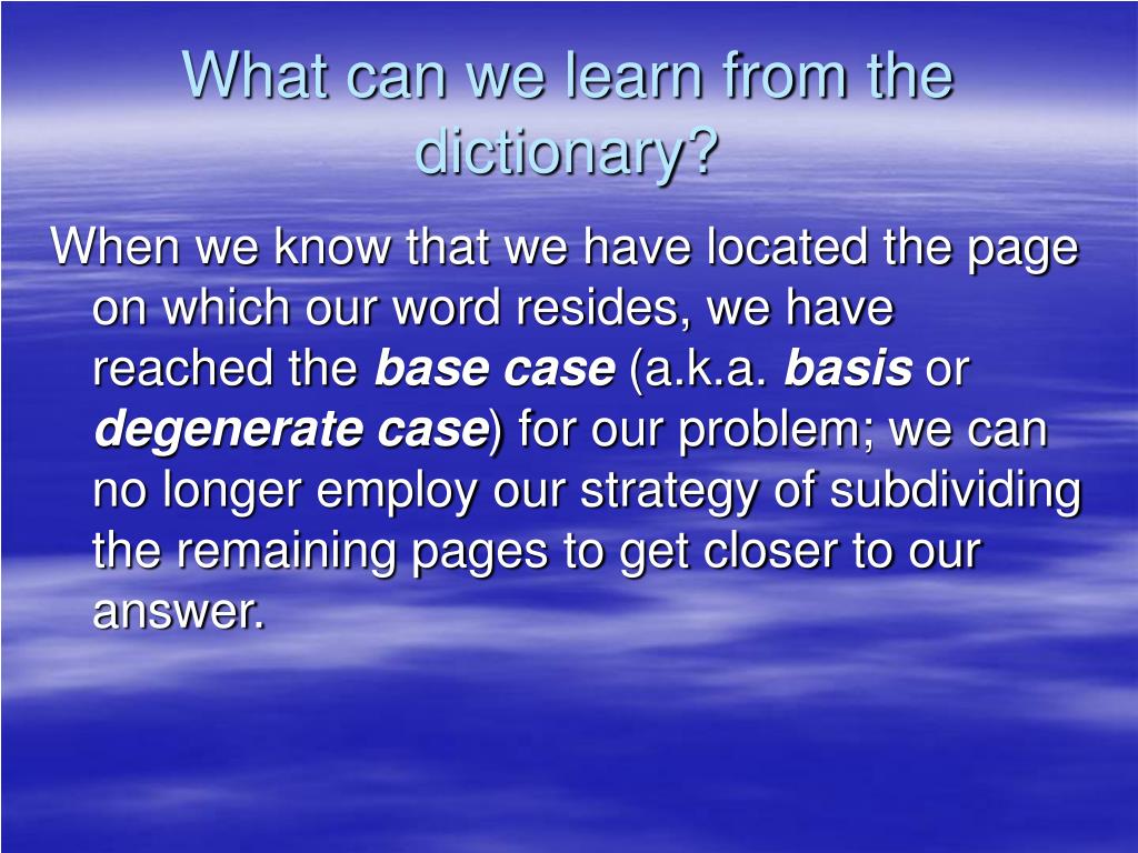 What can we learn from the dictionary? When we know that we have located the page on which our word resides, we have reached the base case (a.k.a. basis or degenerate case) for our problem; we can no longer employ our strategy of subdividing the remaining pages to get closer to our answer.