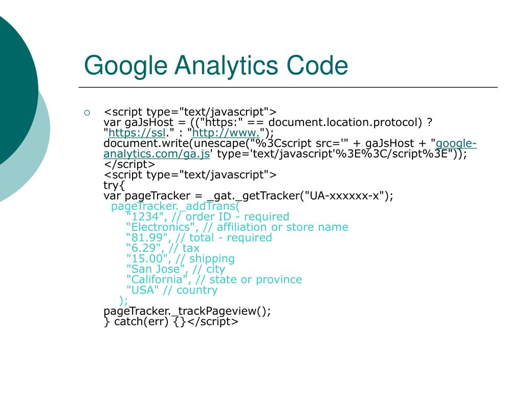 Google Analytics Code • <script type="text/javascript">var gaJsHost = (("https:" == document.location.protocol) ? "https://ssl." : "http://www.");document.write(unescape("%3Cscript src='" + gaJsHost + "google-analytics.com/ga.js' type='text/javascript'%3E%3C/script%3E"));</script><script type="text/javascript">try{var pageTracker = _gat._getTracker("UA-xxxxxx-x"); pageTracker._addTrans( "1234", // order ID - required “Electronics", // affiliation or store name “81.99", // total - required “6.29", // tax "15.00", // shipping "San Jose", // city "California", // state or province "USA" // country );pageTracker._trackPageview();} catch(err) {}</script>