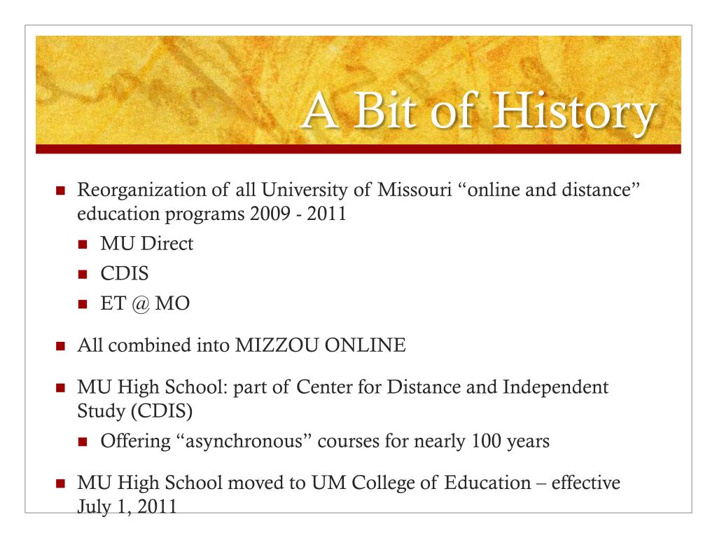 A Bit of History • Reorganization of all University of Missouri “online and distance” education programs 2009 - 2011 • MU Direct • CDIS • ET @ MO • All combined into MIZZOU ONLINE • MU High School: part of Center for Distance and Independent Study (CDIS) • Offering “asynchronous” courses for nearly 100 years • MU High School moved to UM College of Education – effective July 1, 2011