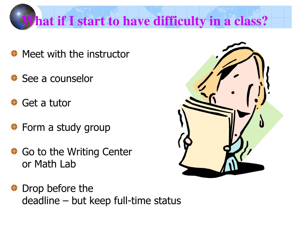 What if I start to have difficulty in a class? • Meet with the instructor • See a counselor • Get a tutor • Form a study group • Go to the Writing Center or Math Lab • Drop before the deadline – but keep full-time status