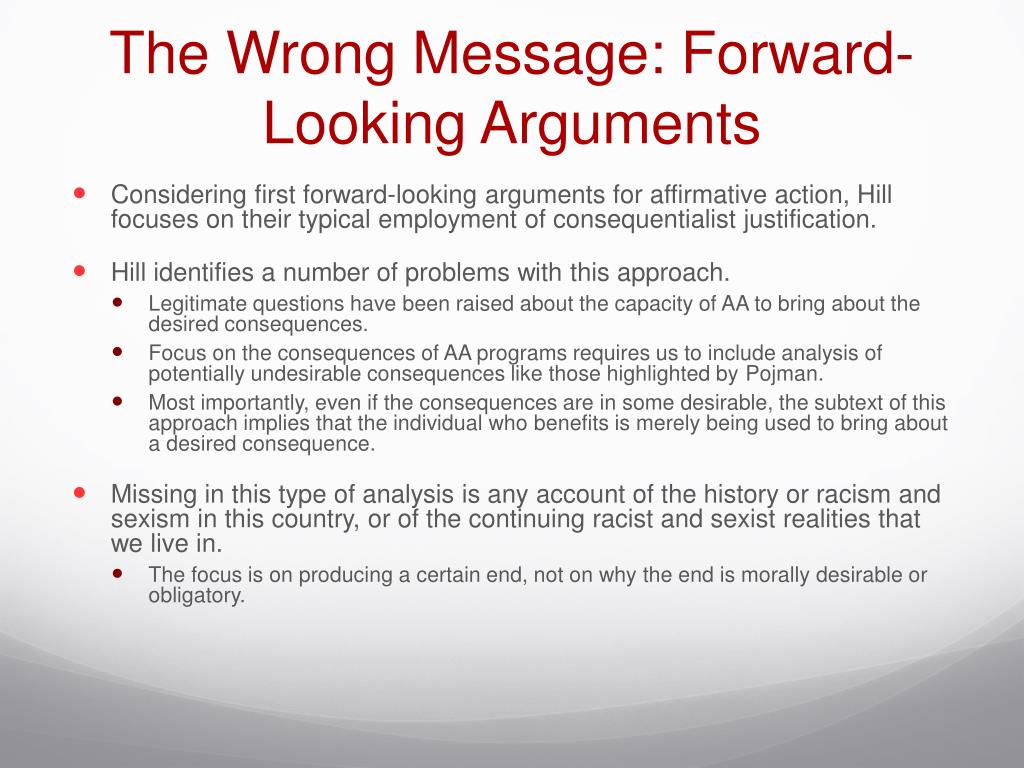 The Wrong Message: Forward- Looking Arguments • Considering first forward-looking arguments for affirmative action, Hill focuses on their typical employment of consequentialist justification. • Hill identifies a number of problems with this approach. • Legitimate questions have been raised about the capacity of AA to bring about the desired consequences. • Focus on the consequences of AA programs requires us to include analysis of potentially undesirable consequences like those highlighted by Pojman. • Most importantly, even if the consequences are in some desirable, the subtext of this approach implies that the individual who benefits is merely being used to bring about a desired consequence. • Missing in this type of analysis is any account of the history or racism and sexism in this country, or of the continuing racist and sexist realities that we live in. • The focus is on producing a certain end, not on why the end is morally desirable or obligatory.