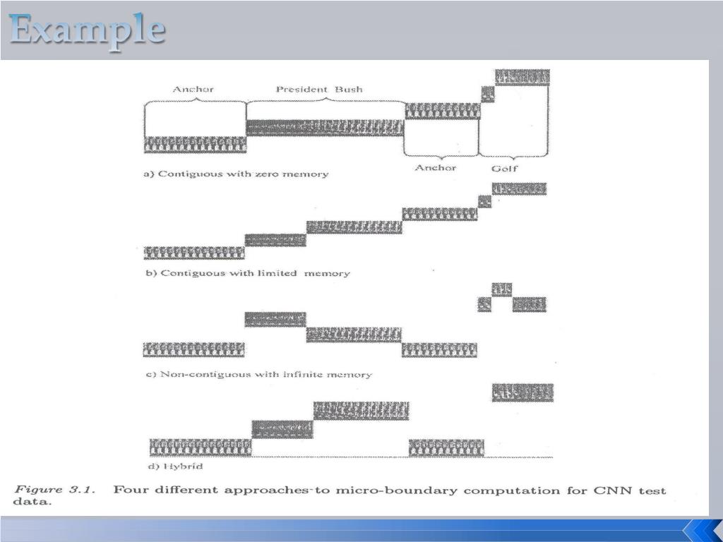 Single Modality Segmentaion Audio segmentation & classification Text transcript Partition a continuous bitstream of audio data into non-overlapping segments Extracted from either the closed captions or speech-to-text conversion Classification Frequency-of-word-occurrence metric is used Using low-level audio features Segmented and categorized with respect to a predefined topic list Seven mid-level audio categories