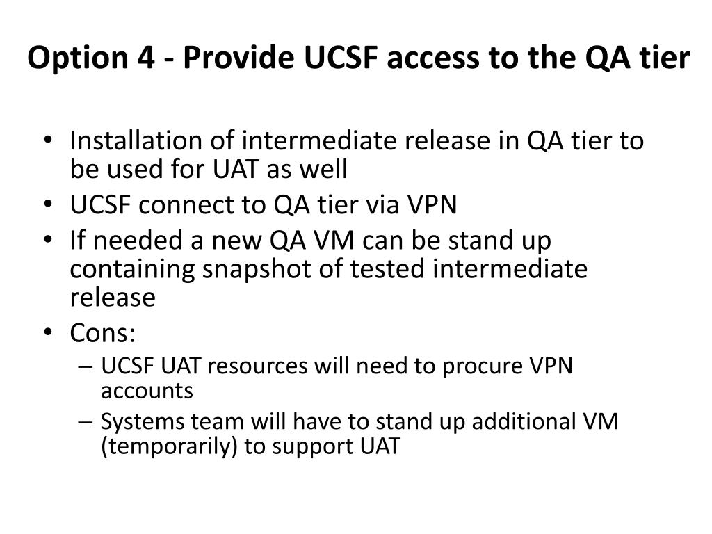 Option 4 - Provide UCSF access to the QA tier • Installation of intermediate release in QA tier to be used for UAT as well • UCSF connect to QA tier via VPN • If needed a new QA VM can be stand up containing snapshot of tested intermediate release • Cons: • UCSF UAT resources will need to procure VPN accounts • Systems team will have to stand up additional VM (temporarily) to support UAT