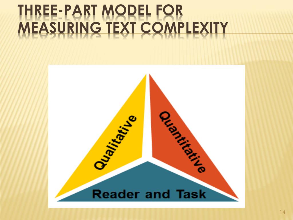 Levels of meaning or purpose • Structure • Language conventionality and clarity • Knowledge demands Step #2: Qualitative measures • Elfrieda H. Hiebert – The Common Core State Standards and Text Complexity