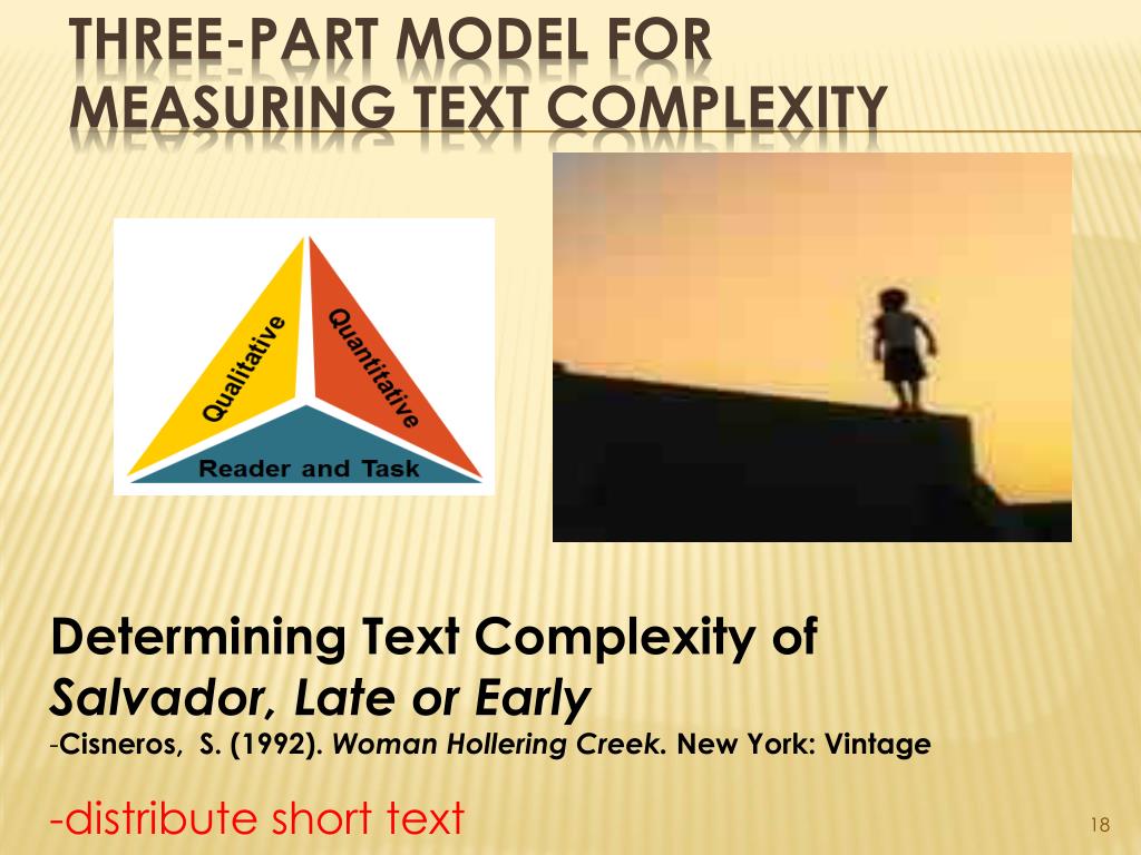 Three-Part Model for Measuring Text Complexity Determining Text Complexity of Salvador, Late or Early -Cisneros, S. (1992). Woman Hollering Creek. New York: Vintage -distribute short text